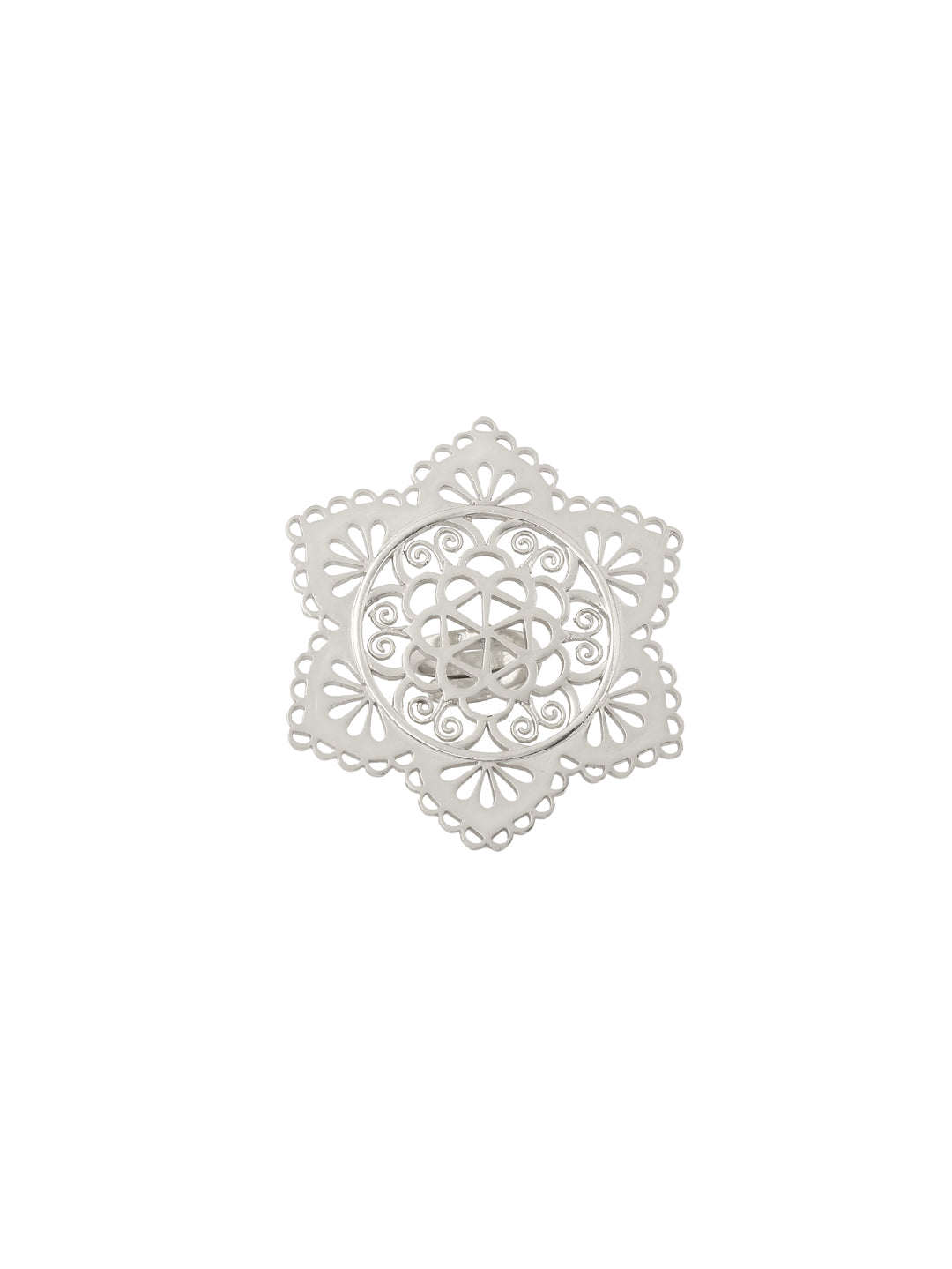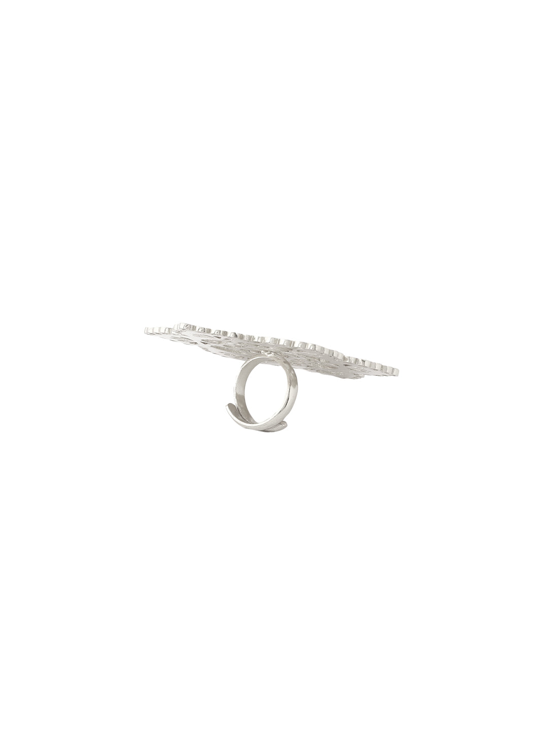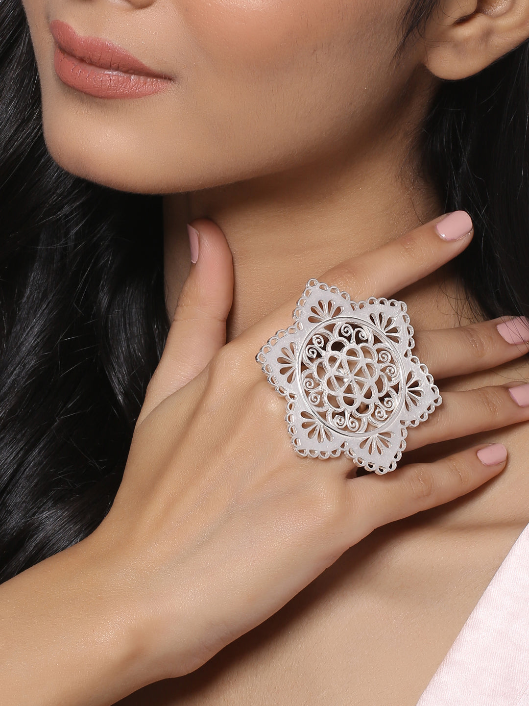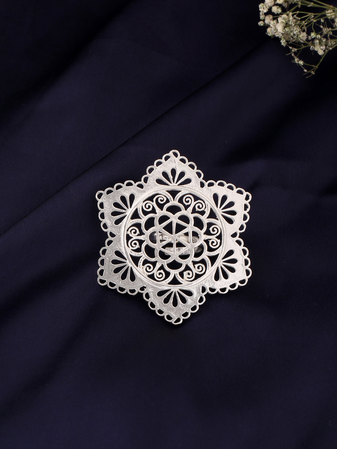This Gul Bahaar Ring is crafted from pure silver, delicately crafted in a mashrab jaal design for a timeless, elegant look. Expertly crafted, this heirloom-ready piece is sure to bring a touch of sophistication and exclusivity to any ensemble. A perfect addition to formal occasions or everyday wear.