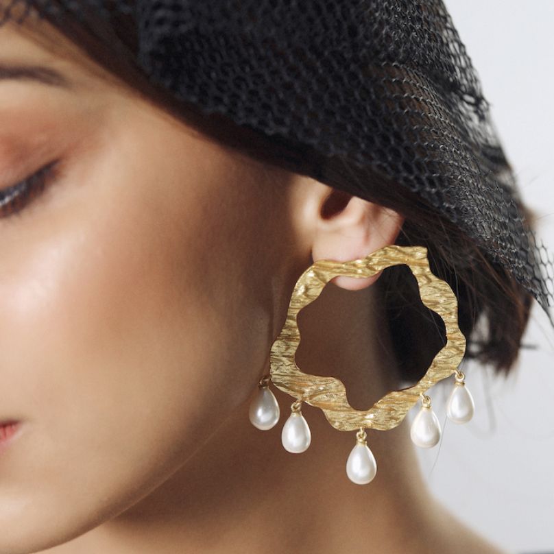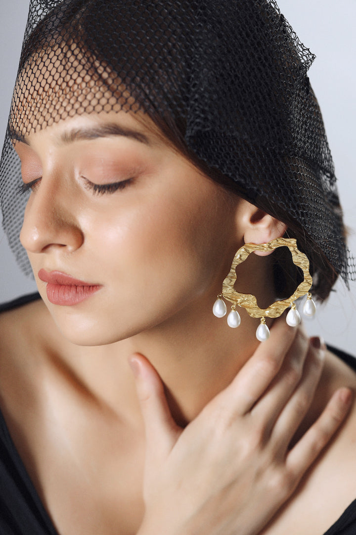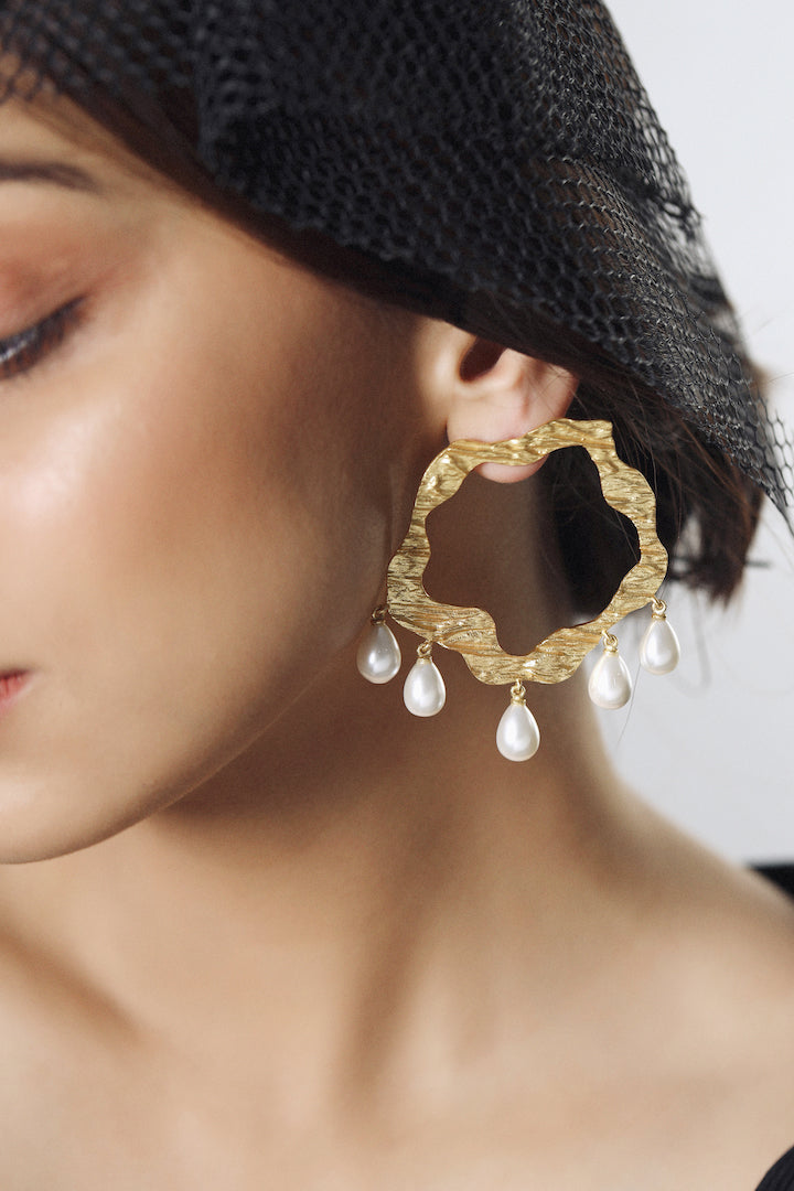 Named after Dianna , Princess of Wales, these earrings are a fusion of white pearls and crushed metal, inspired by her delicate yet bold personality.
