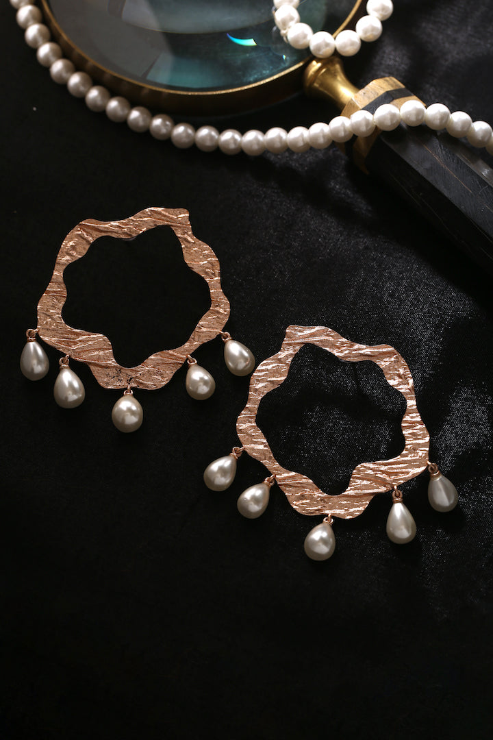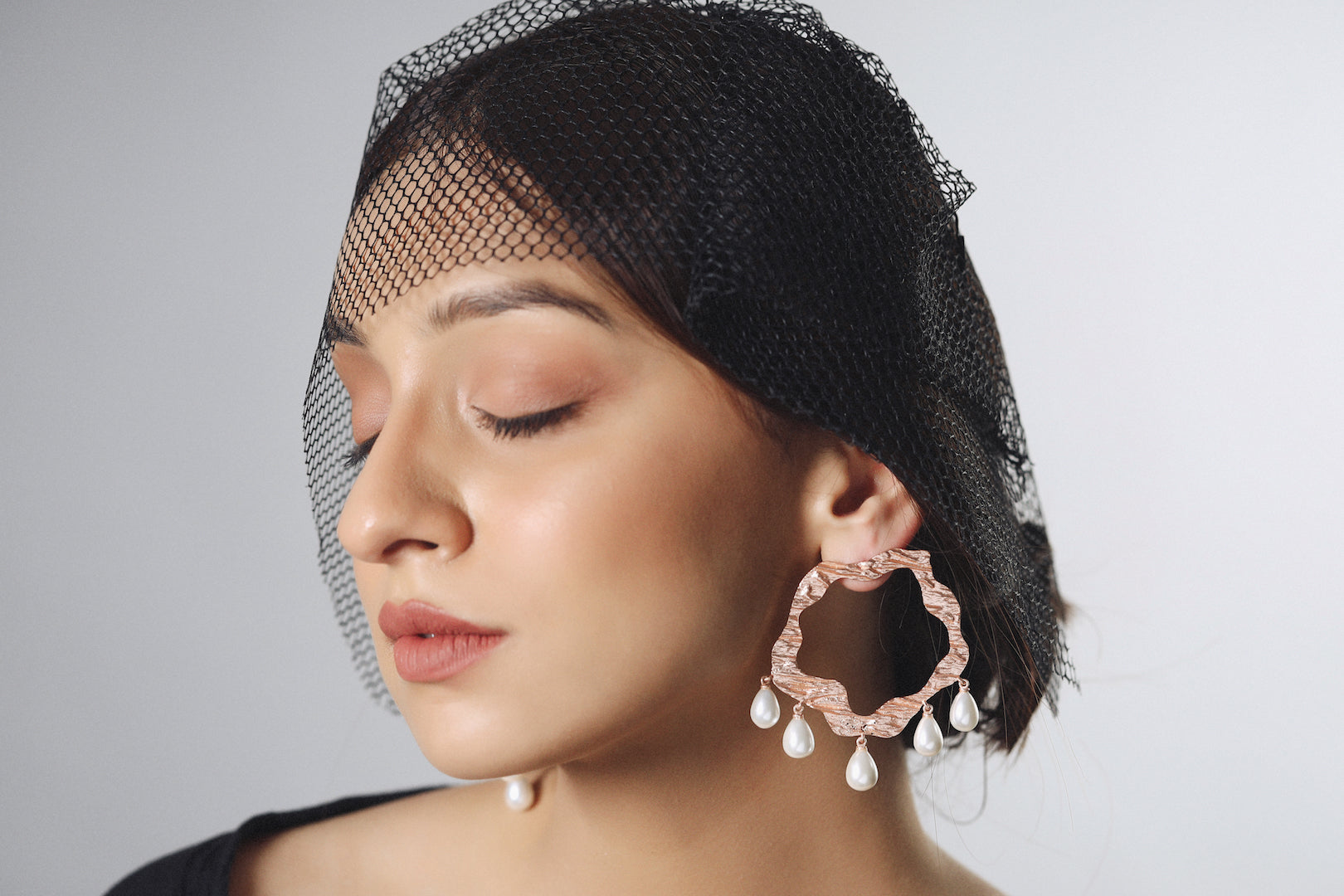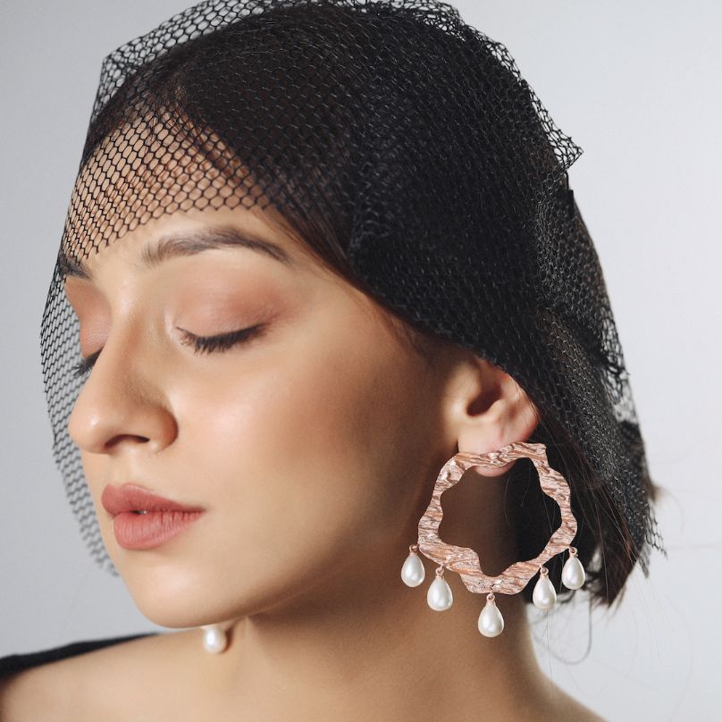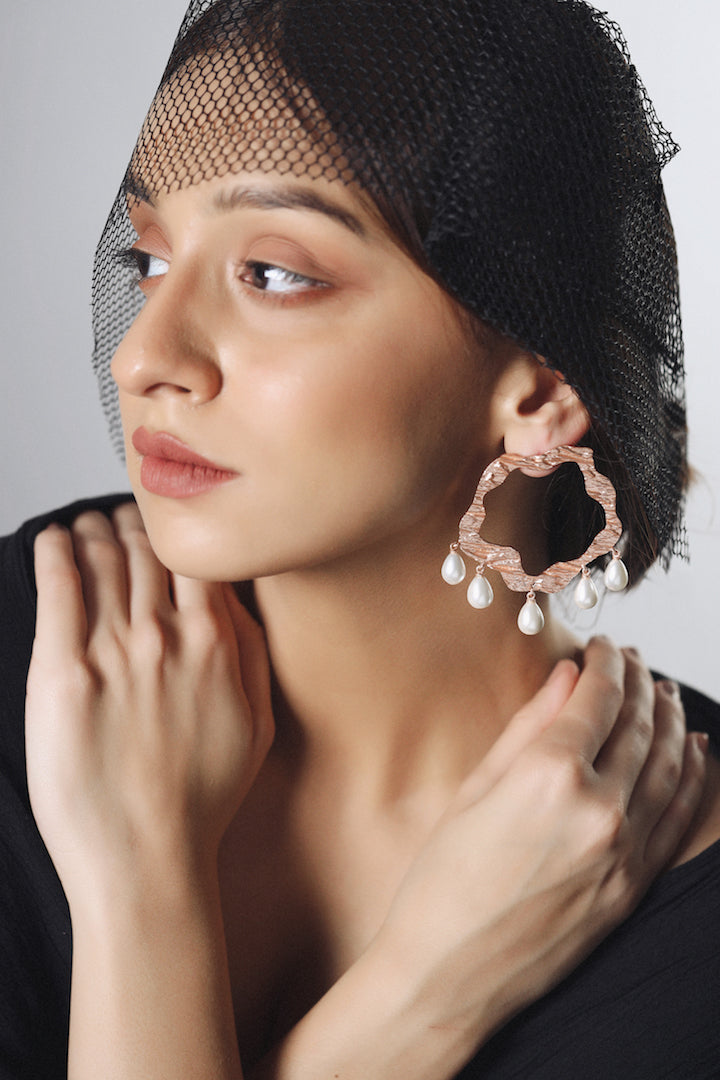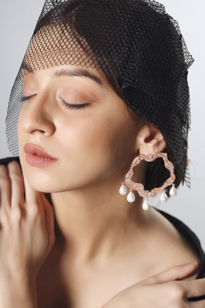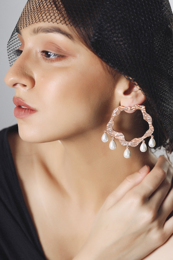 Named after Dianna , Princess of Wales, these earrings are a fusion of white pearls and crushed metal, inspired by her delicate yet bold personality.