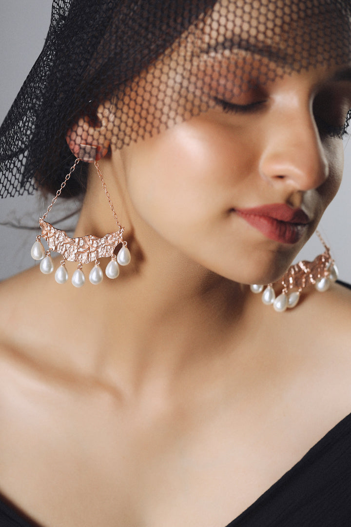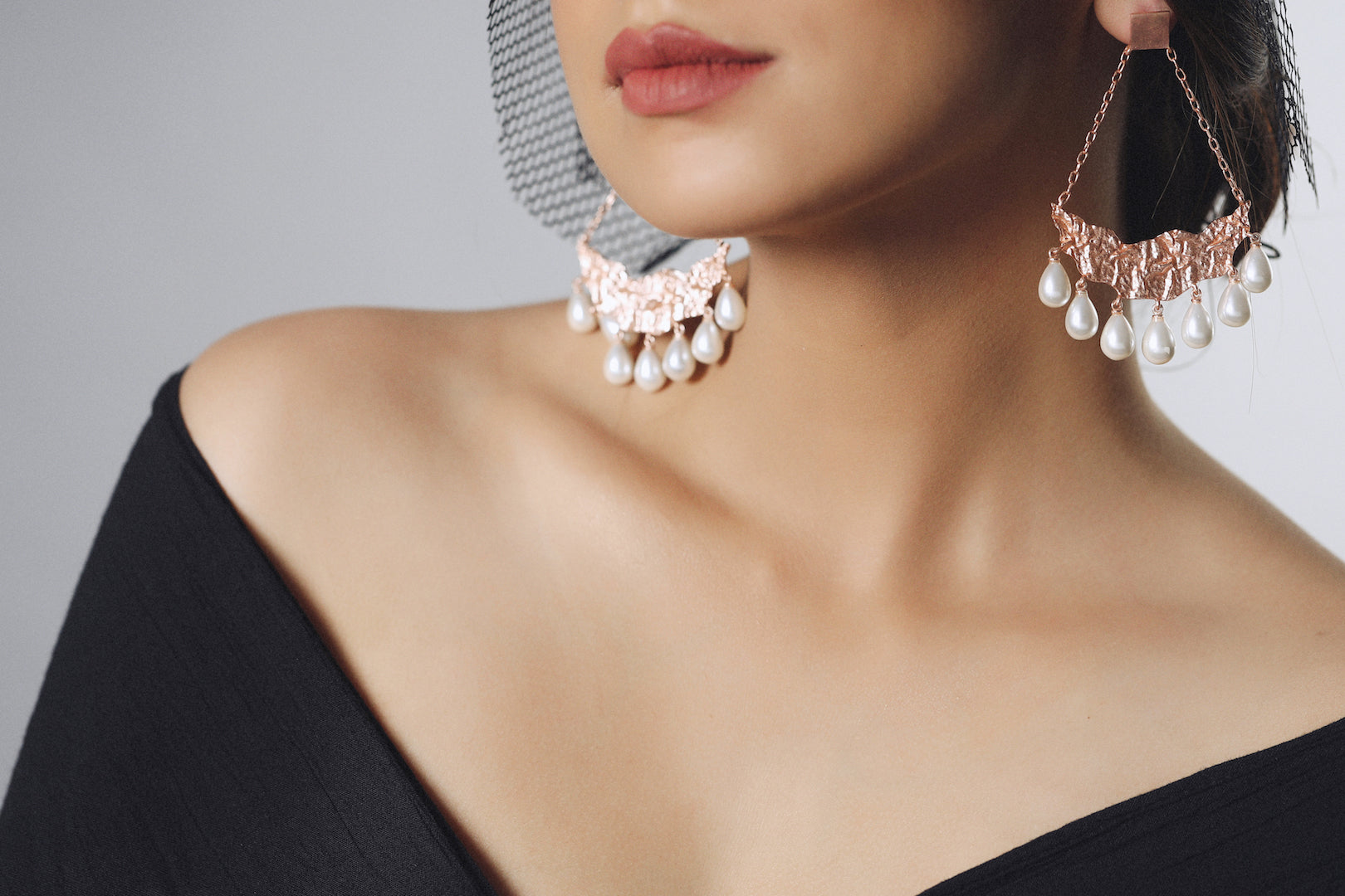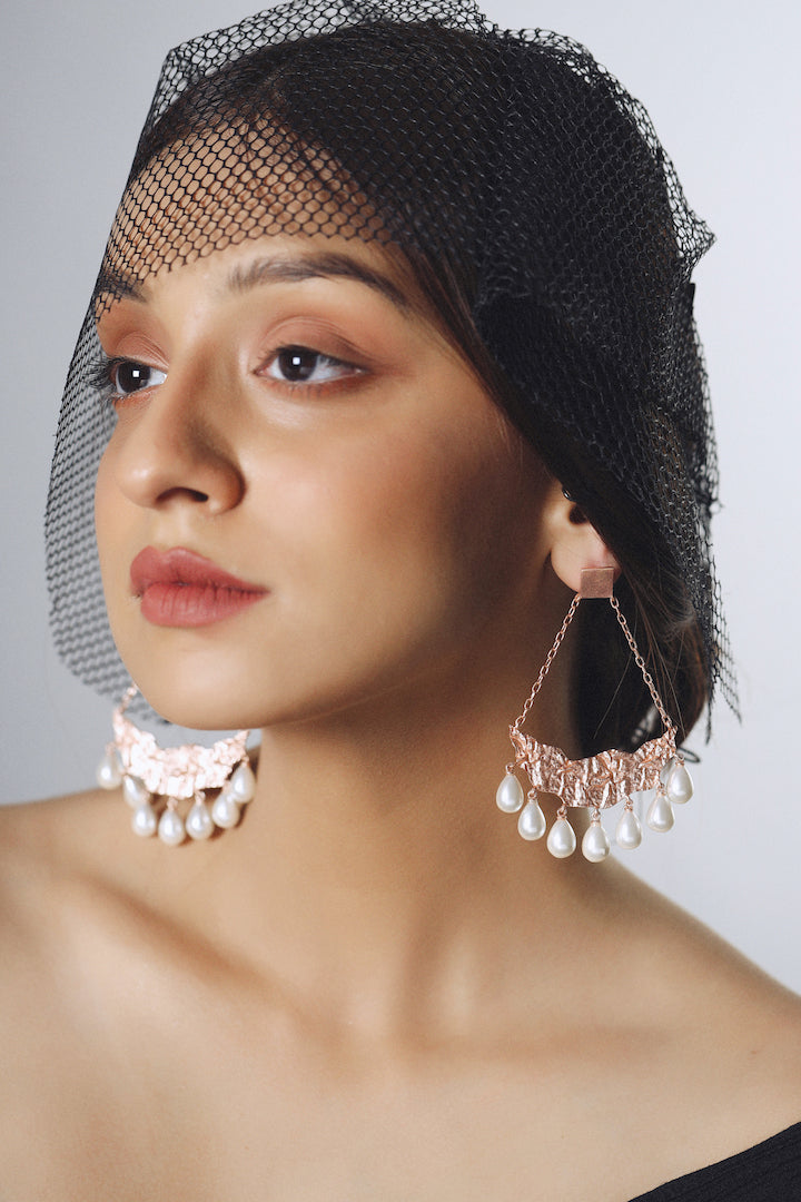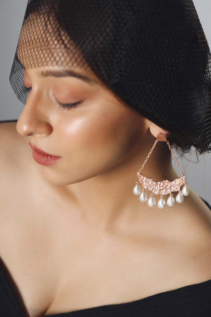 Taking cues from the traditional rani jewellery and named after Maharani Gayatri Devi, these earrings give a contemporary touch to the age old chaandbali. Dressed up with pearls, the 18k rose gold dipped earrings makes a pretty addition to not only your traditional outfits but adds the modern Indian touch .