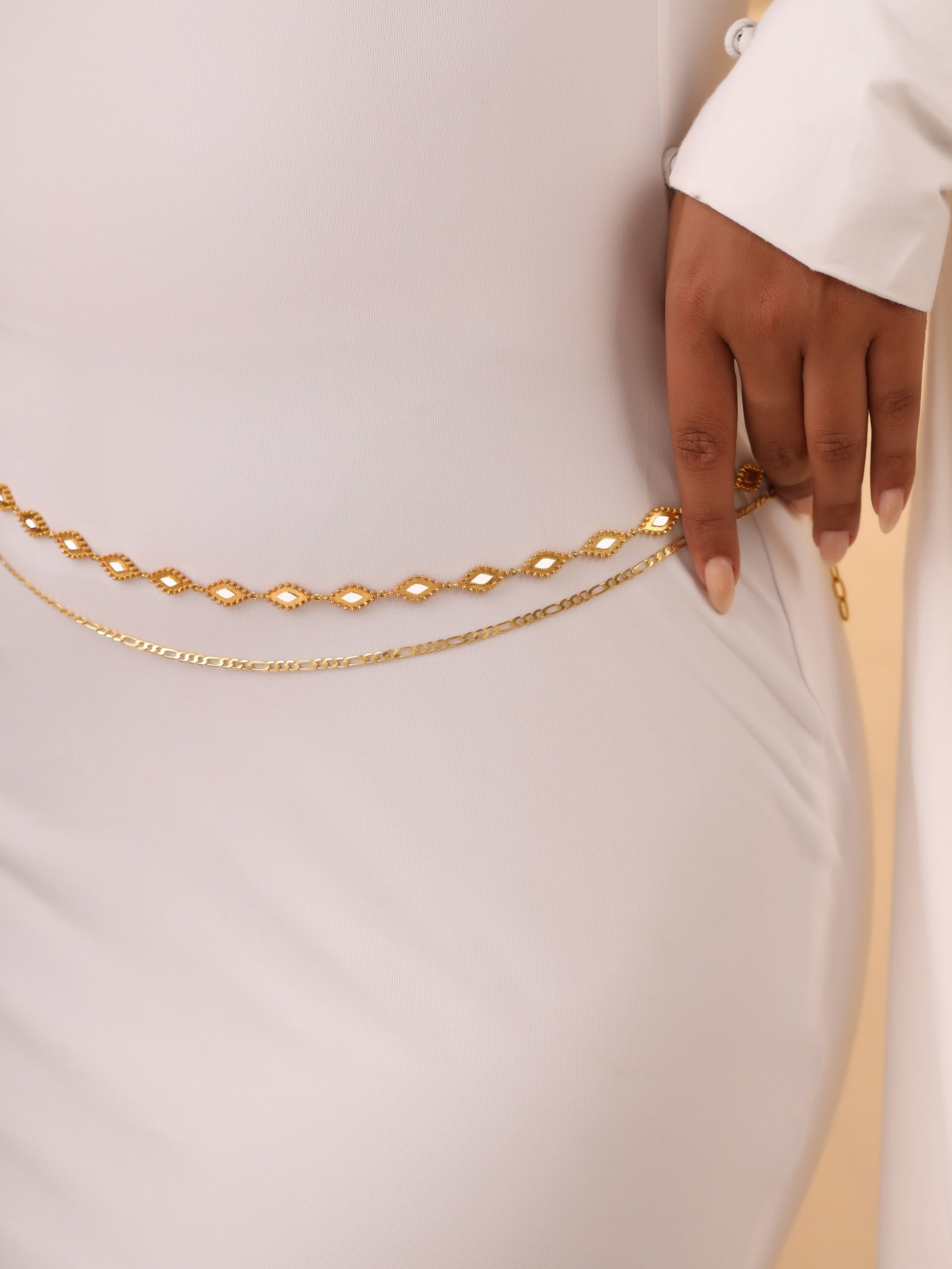 A belt with detachable lower chain and can be worn as belt in two ways.