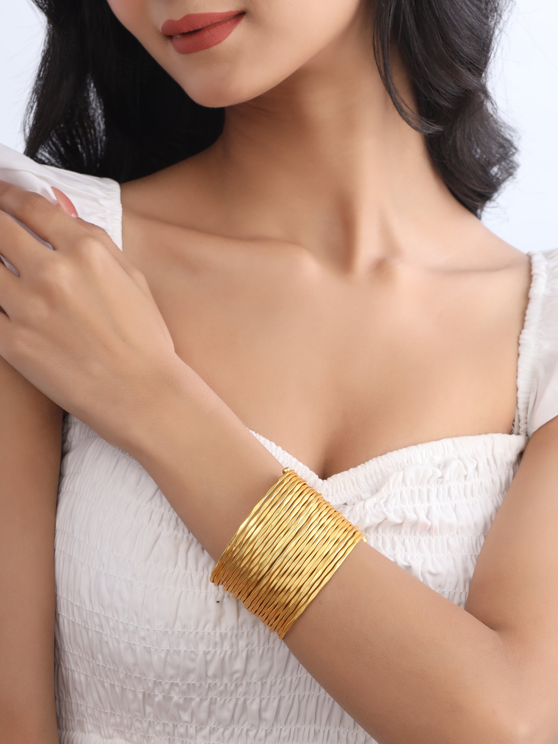 A gold hand jewellery with bold aesthetics, an accessory for your evening soiree.
