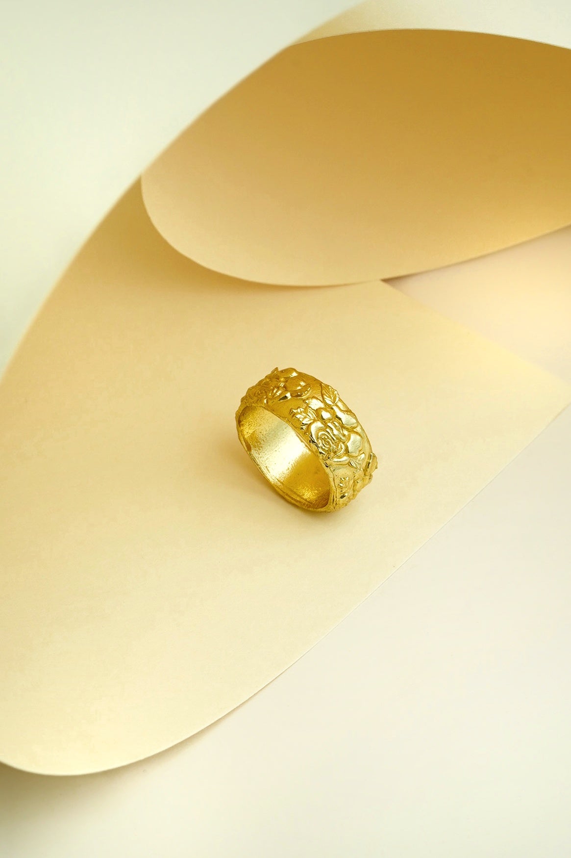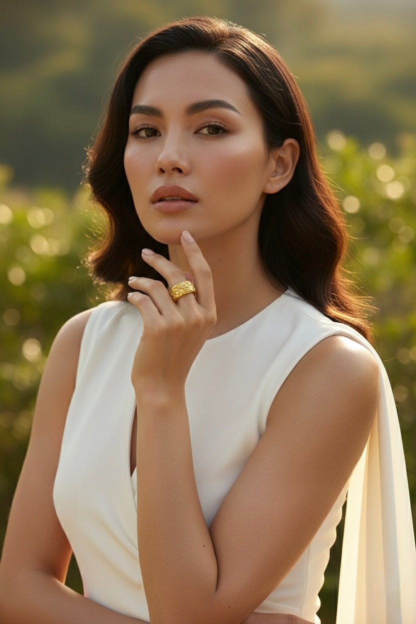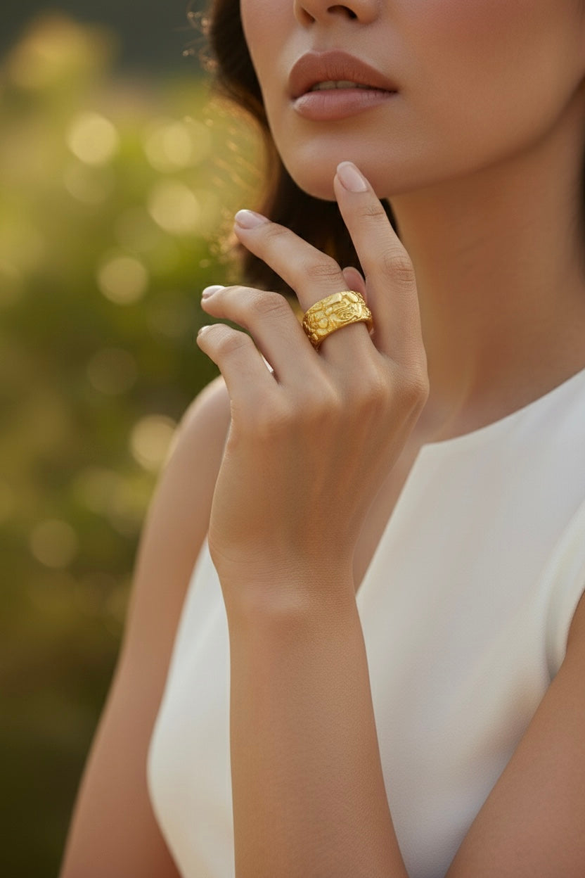 A statement gold-toned band adorned with intricate engraved detailing that reflects regal elegance and craftsmanship. The bold, textured design gives this ring a luxurious presence, making it perfect for special occasions or elevating everyday looks.
