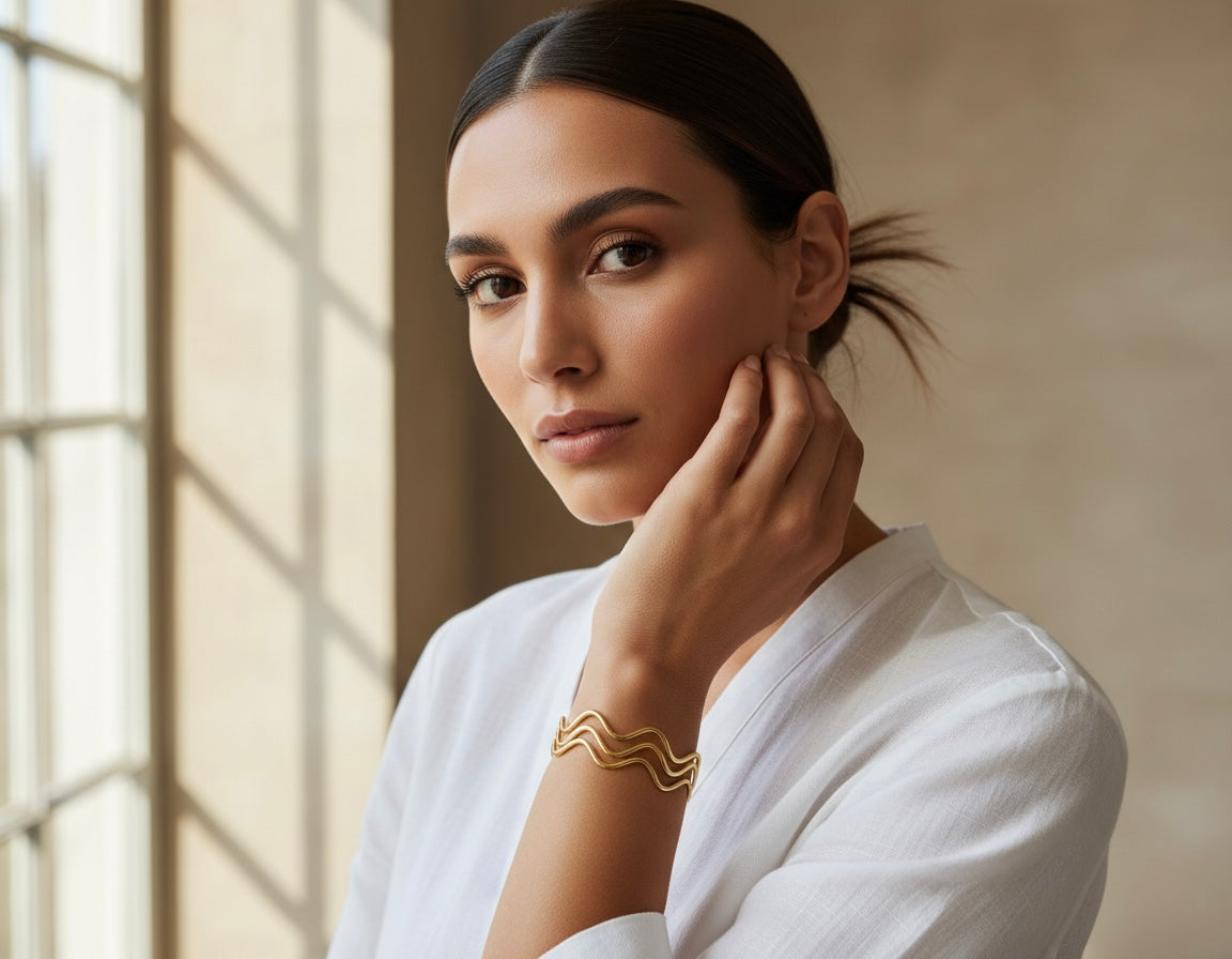 Inspired by the fluidity of waves, this gold cuff bracelet features a sleek, sculptural design that flows effortlessly around the wrist. Lightweight yet striking, it adds a touch of modern elegance to any look — perfect for both everyday wear and special occasions.